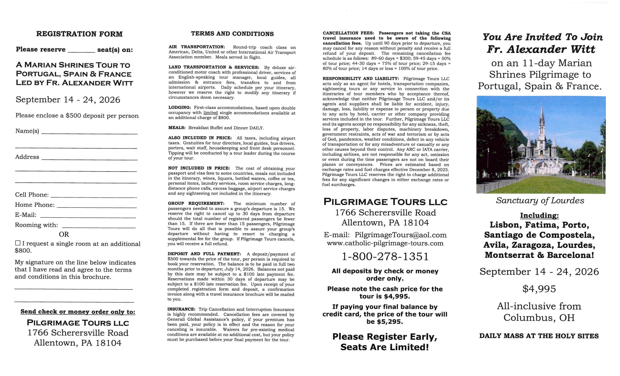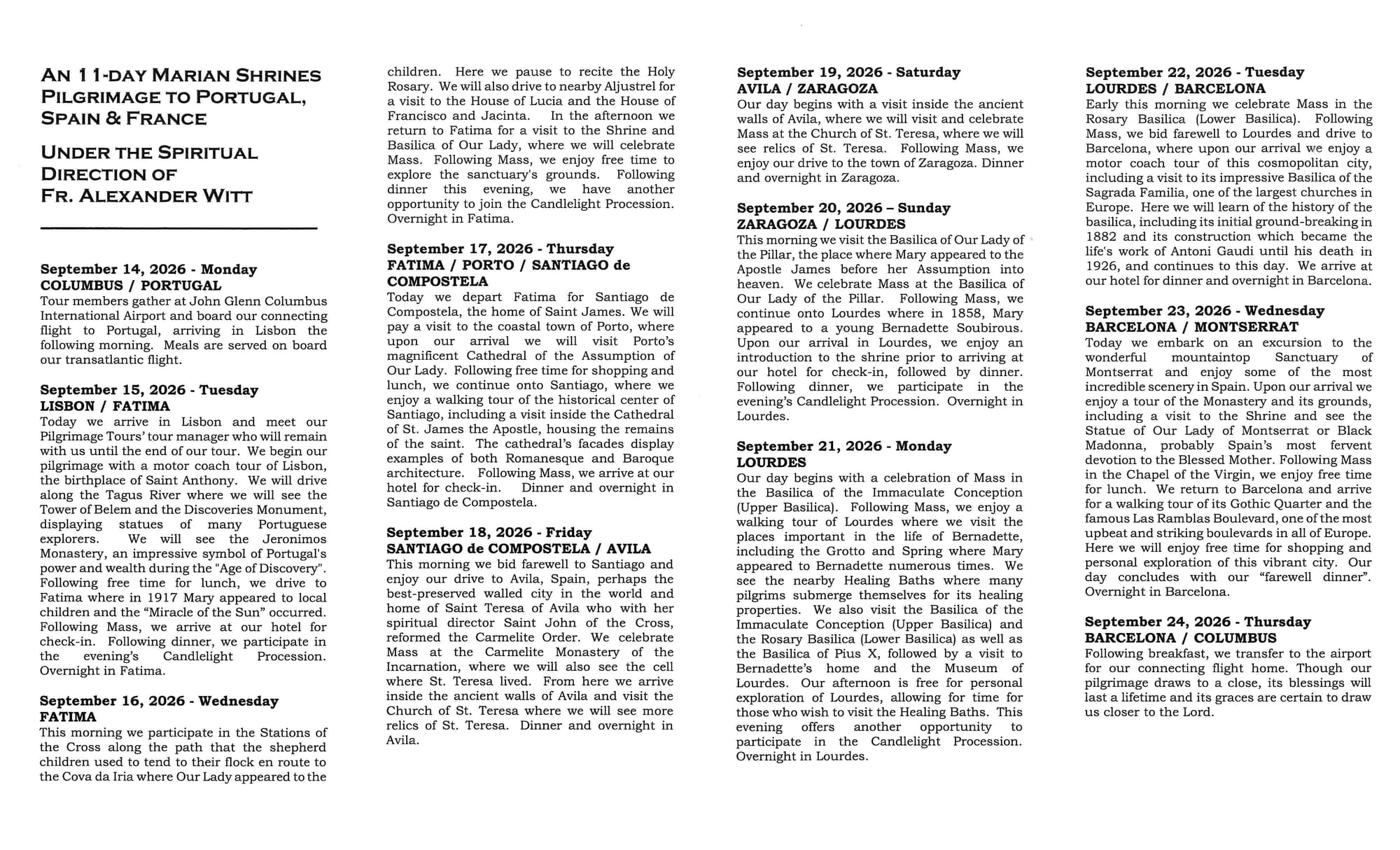 PILGRIMAGE INFORMATION: Fr. Witt will be leading a pilgrimage from Sept. 14 - 24, 2026, to Portugal, Spain, & France. Brochures are now available in our churches, or print out and turn in the brochure below. Register early, seating is limited!
