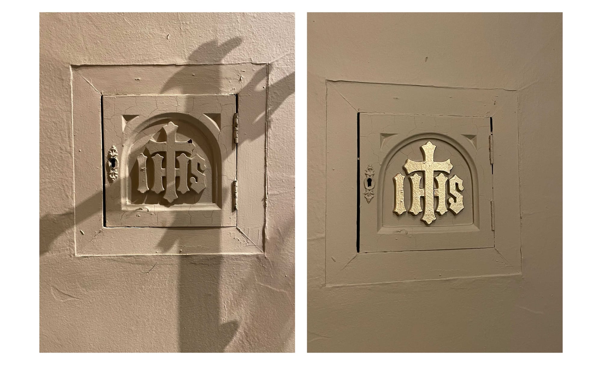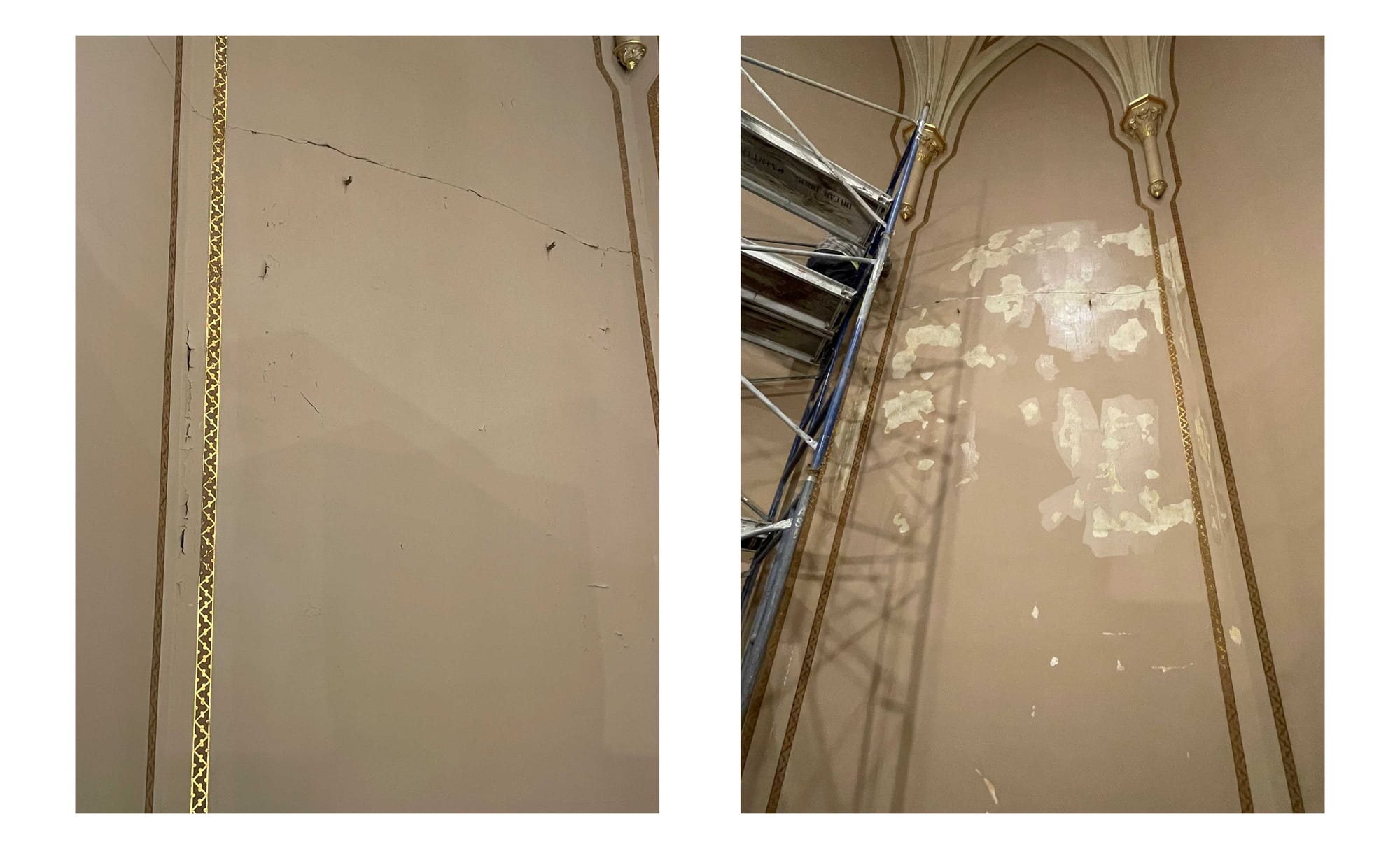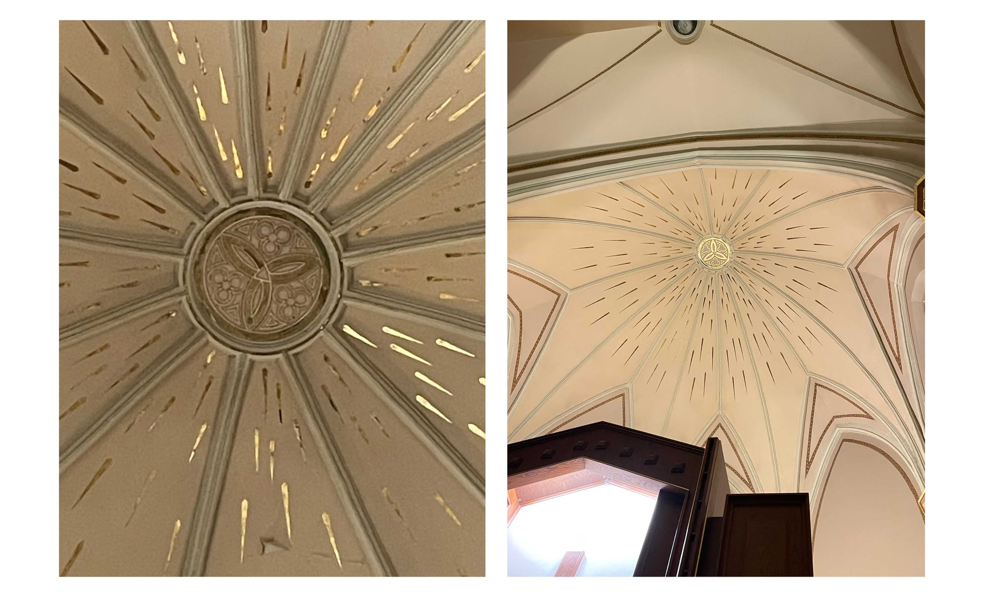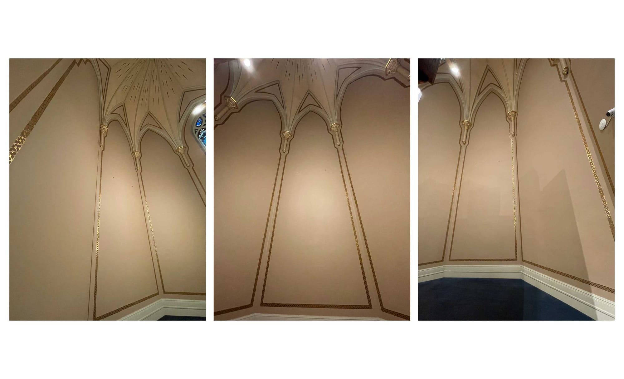 The photos above show the before and after wall repair & paint, followed by the ceiling repair and paint, and finally the Ambry highlight in gold after repainting.