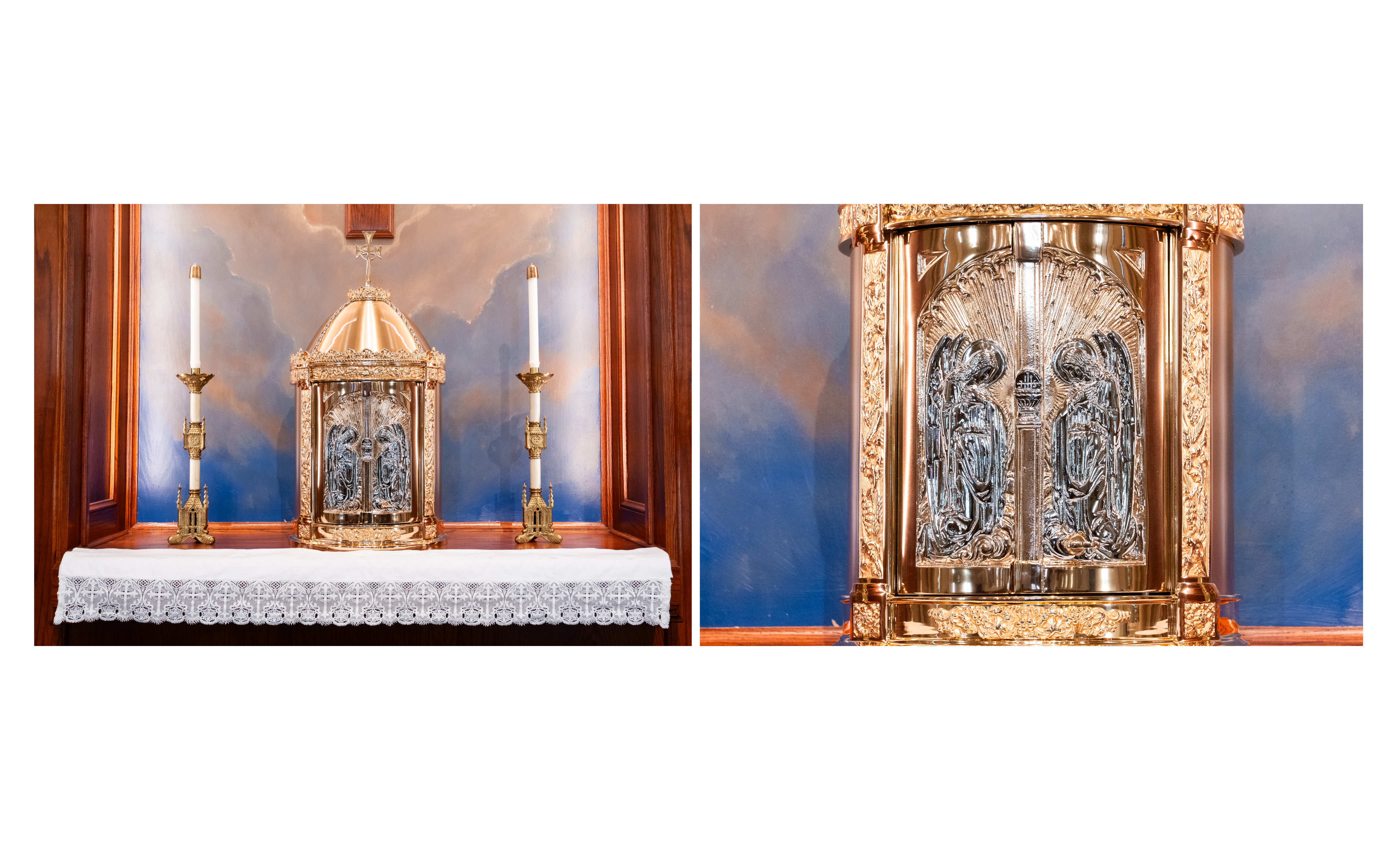It replaces the previous tabernacle that's door was to small for most of our ciborium which are >12” tall. The old tabernacle's 11” door height opening has resulted in many of the ciborium being scratched and damaged over the years while attempting to place them into the tabernacle. This new domed tabernacle is 36”H x 19”D with a door opening of 14”H x 9.5”W.